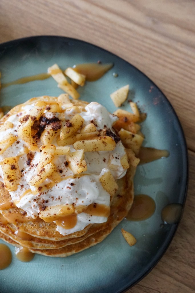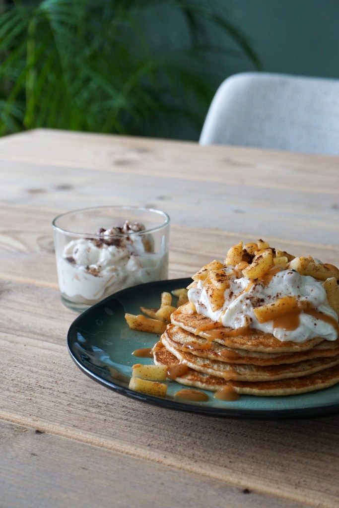 - doe wat skyr bovenop de pannenkoekenstapel en lepel daar wat van de appelstukjes over
