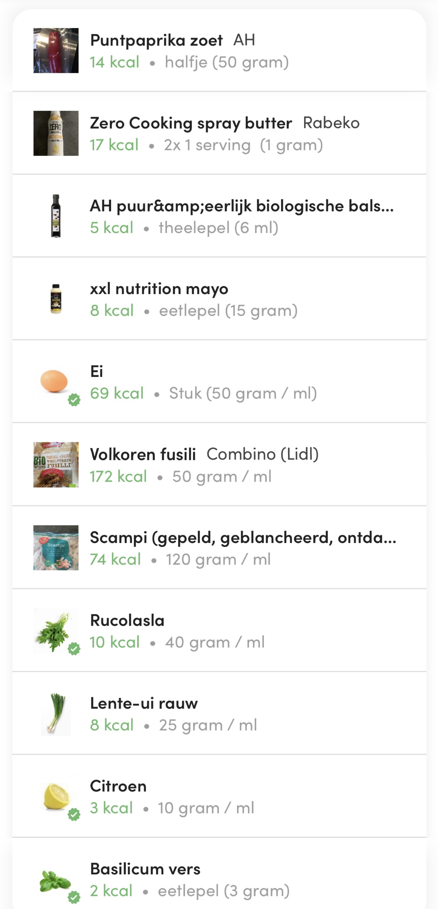 - leg de scampi er alvast op en werk de pasta af met wat low cal mayo, balsamico azijn en knijp een beetje van de citroen over de scampi