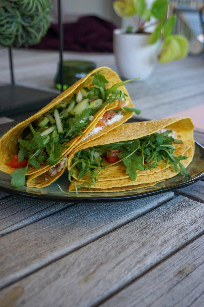 - smeer 1/4e van de wrap in met cottage cheese, kruid af met dille, peper en zout en beleg verder met de gerookte zalm