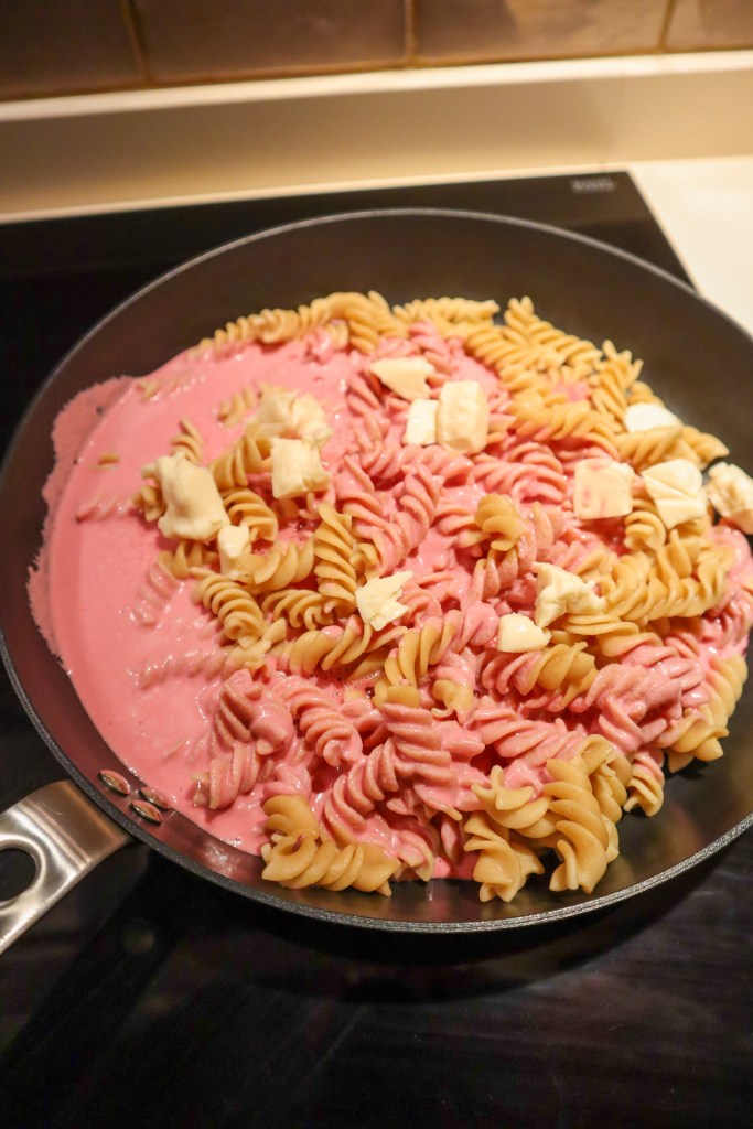 - giet de saus uit de blender over de pasta en zet de pan op een laag tot medium vuurtje