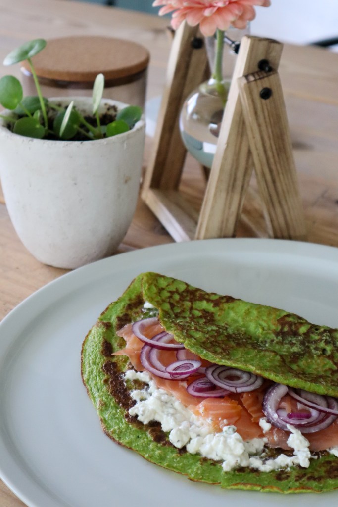 - bestrijk de pannenkoeken met de cottage cheese, doe de gerookte zalm erbij en snipper de ajuin er fijn over