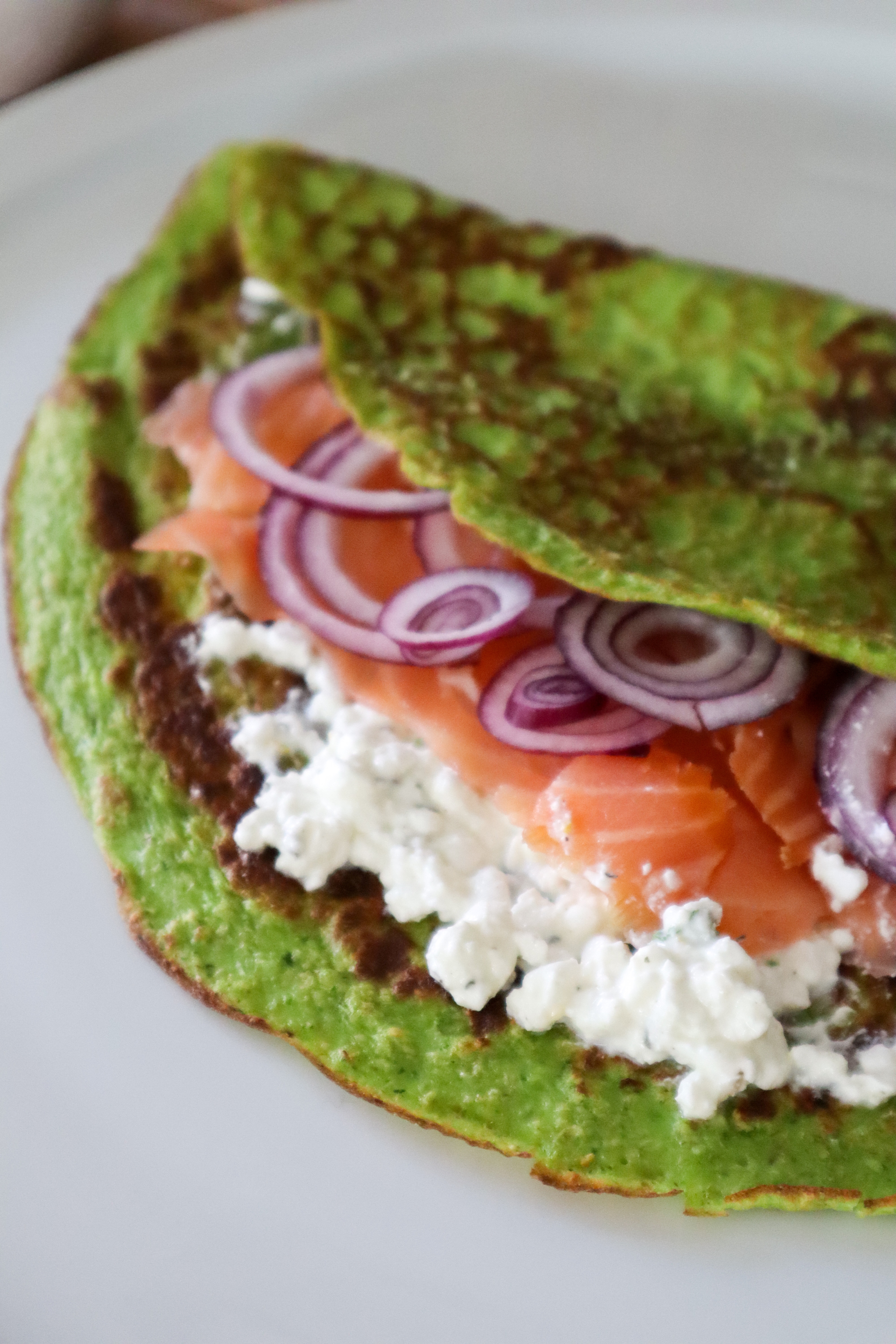 - bestrijk de pannenkoeken met de cottage cheese, doe de gerookte zalm erbij en snipper de ajuin er fijn over